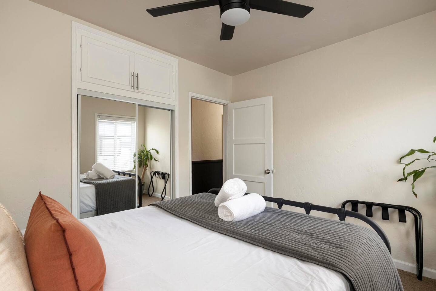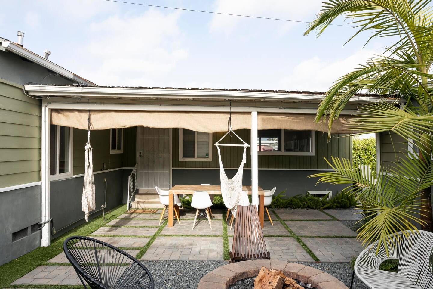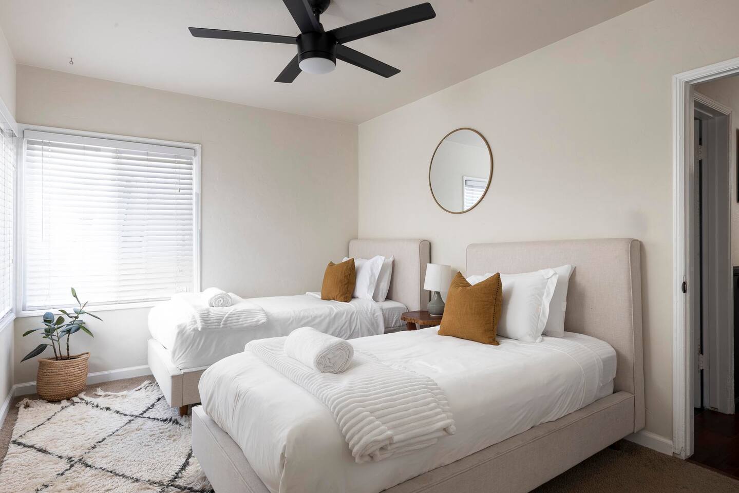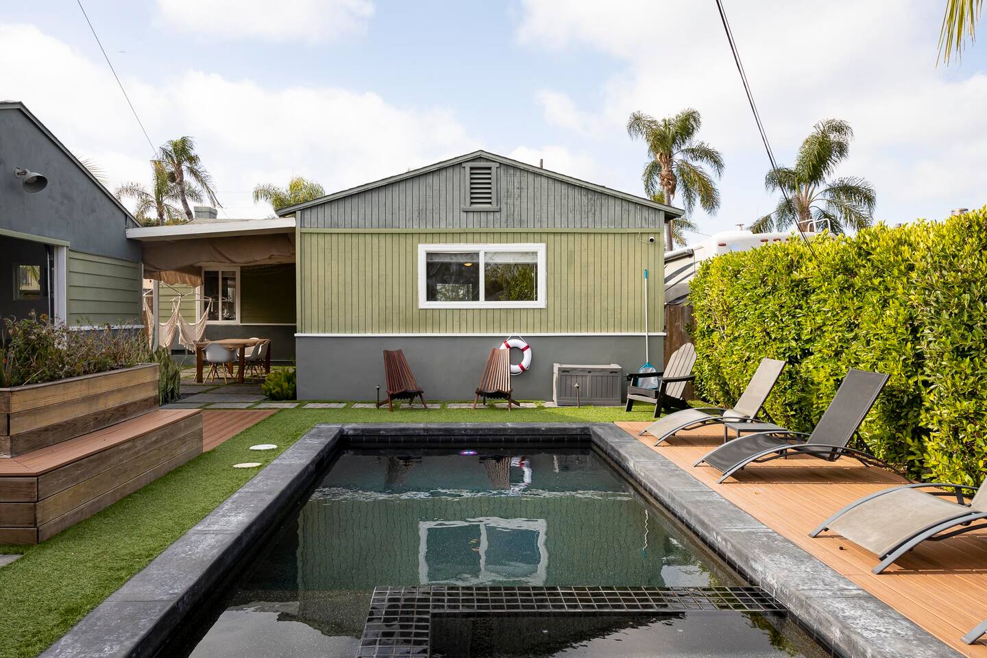 🏡 The Home (at a glance) - 3 bedrooms + detached studio / pool house - 3 full bathrooms - Chef’s kitchen + large island for group meals - Single-level layout - 4-car parking Built for groups who want space, privacy, and an experience—not just a place to sleep. 🛏️ Sleeps 13 Designed for group comfort with hotel-quality mattresses and luxury linens throughout the main house and studio. Sleeping setup includes: - 1 King - 1 Queen - 2 Twins - 2 Queen sofa beds - 2 Twin sofa beds - 1x Rollaway/foldable bed We also provide 2 comfy auto-inflating air mattresses (to enable different sleeping arrangements ) Baby amenities available upon request in advance (changing pad + high chair). 🌴 Private Backyard Oasis The backyard is the highlight and ideal for group hangs: - Private swimming pool (optional heat available) - Large hot tub - Outdoor movie setup with projector (watch from the hot tub) - Wood fire pit - Covered outdoor dining with string lights - Grill + pool house sink - Sun loungers & lounge seating - The detached studio opens directly to the pool and includes a full bathroom and countertop + large, making long outdoor days easy and seamless. Perfect for drinks, sharing food, listening to music, and more with a group. 🍽️ Kitchen & Dining Fully equipped for group cooking and entertaining: - Gas stove & oven - Large island for serving & events - Coffee maker + coffee - Blender, toaster, cookware, bakeware - Full place settings, drinkware & wine glasses 🛋️ Living Area - Indoor fireplace - Large smart TV with streaming apps - Comfortable seating + sofa bed - Bright, open layout with curated decor Perfect for movie nights, games, or relaxing after a full day out. 💻 WiFi & Work - 500 Mbps fiber WiFi package from AT&T Ideal for streaming, remote work, and gaming Dedicated workspace with external monitor available 📍 Central San Diego Location Minutes to: - Downtown & Gaslamp - Balboa Park & SD Zoo - Airport - SeaWorld - Beaches, dining, nightlife Enjoy privacy without sacrificing convenience. 🐾 Pets Pets are welcome with prior approval and an additional fee. Please include pets in your booking request.