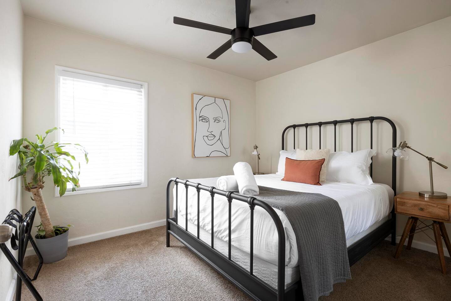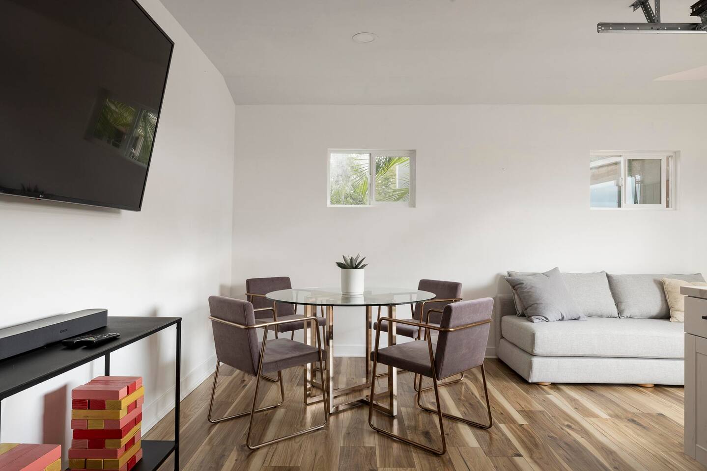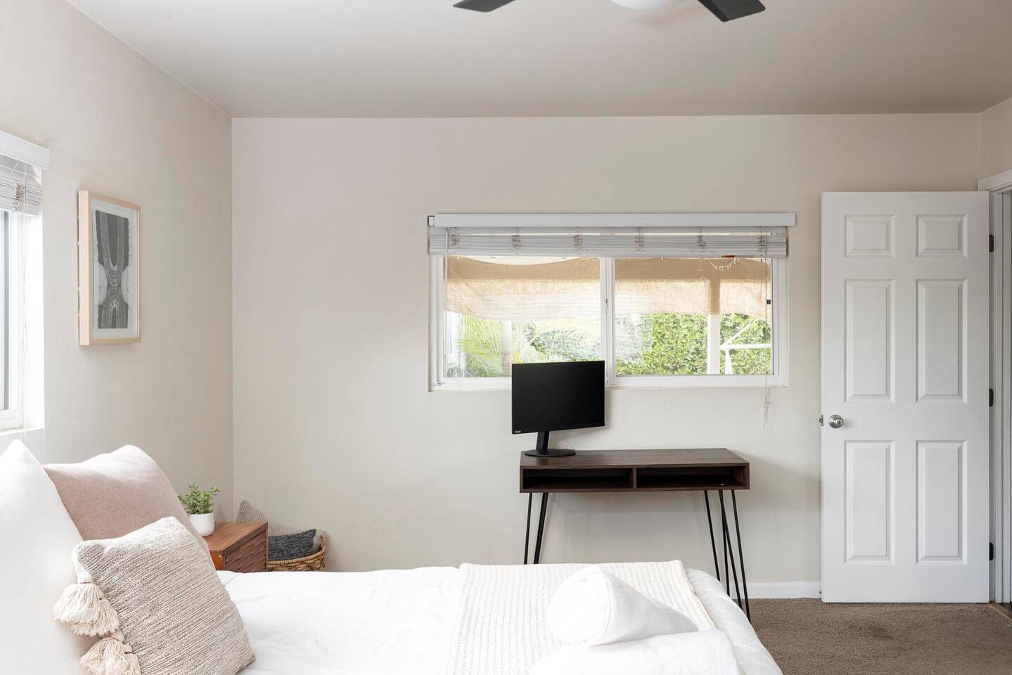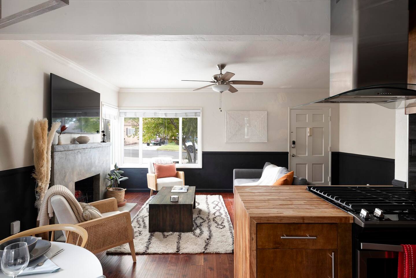 🏡 The Home (at a glance) - 3 bedrooms + detached studio / pool house - 3 full bathrooms - Chef’s kitchen + large island for group meals - Single-level layout - 4-car parking Built for groups who want space, privacy, and an experience—not just a place to sleep. 🛏️ Sleeps 13 Designed for group comfort with hotel-quality mattresses and luxury linens throughout the main house and studio. Sleeping setup includes: - 1 King - 1 Queen - 2 Twins - 2 Queen sofa beds - 2 Twin sofa beds - 1x Rollaway/foldable bed We also provide 2 comfy auto-inflating air mattresses (to enable different sleeping arrangements ) Baby amenities available upon request in advance (changing pad + high chair). 🌴 Private Backyard Oasis The backyard is the highlight and ideal for group hangs: - Private swimming pool (optional heat available) - Large hot tub - Outdoor movie setup with projector (watch from the hot tub) - Wood fire pit - Covered outdoor dining with string lights - Grill + pool house sink - Sun loungers & lounge seating - The detached studio opens directly to the pool and includes a full bathroom and countertop + large, making long outdoor days easy and seamless. Perfect for drinks, sharing food, listening to music, and more with a group. 🍽️ Kitchen & Dining Fully equipped for group cooking and entertaining: - Gas stove & oven - Large island for serving & events - Coffee maker + coffee - Blender, toaster, cookware, bakeware - Full place settings, drinkware & wine glasses 🛋️ Living Area - Indoor fireplace - Large smart TV with streaming apps - Comfortable seating + sofa bed - Bright, open layout with curated decor Perfect for movie nights, games, or relaxing after a full day out. 💻 WiFi & Work - 500 Mbps fiber WiFi package from AT&T Ideal for streaming, remote work, and gaming Dedicated workspace with external monitor available 📍 Central San Diego Location Minutes to: - Downtown & Gaslamp - Balboa Park & SD Zoo - Airport - SeaWorld - Beaches, dining, nightlife Enjoy privacy without sacrificing convenience. 🐾 Pets Pets are welcome with prior approval and an additional fee. Please include pets in your booking request.